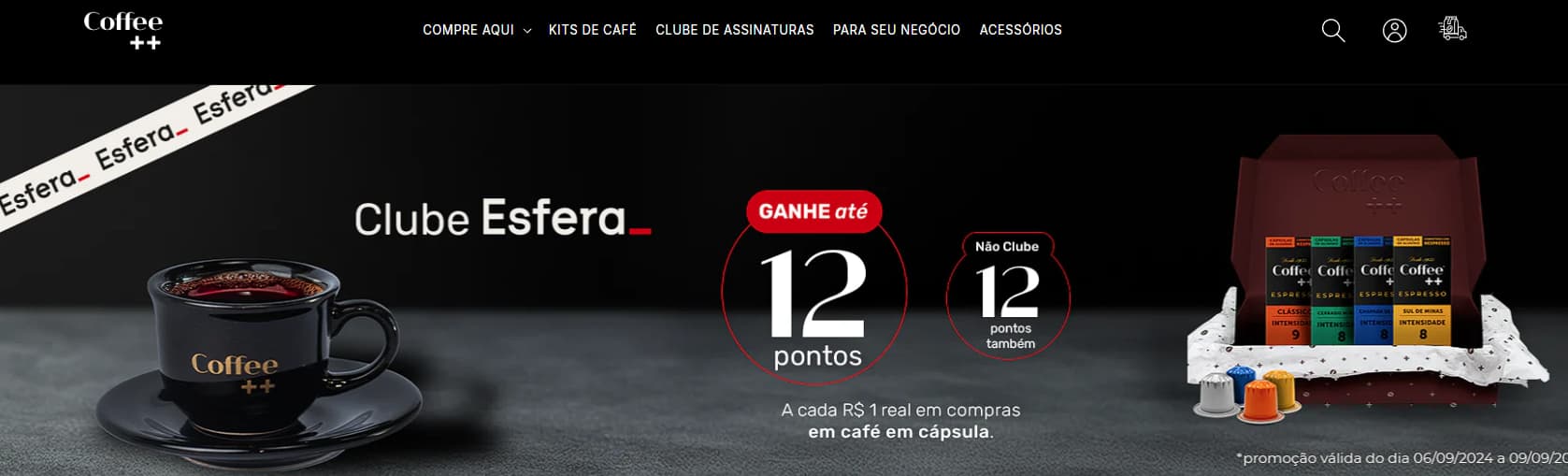 Até segunda-feira (09/09), você pode ganhar até 12 pontos Esfera por cada real gasto na categoria cápsulas do site da Coffee++.