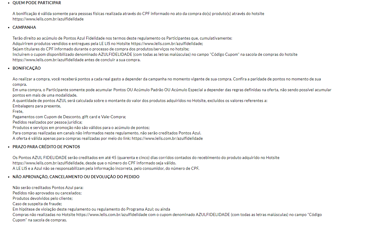 A cada R$1,00 gasto em produtos da Le Lis, você acumula até 20 pontos no programa de milhas da Azul.
