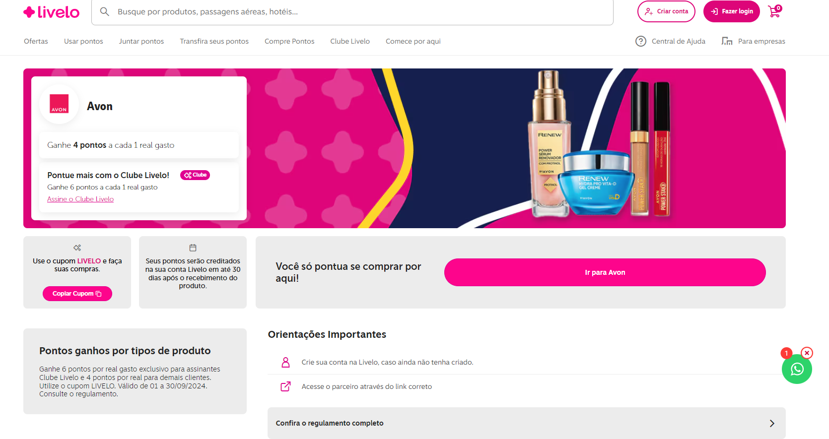 Se você faz parte do Clube Livelo, poderá ganhar até 6 pontos a cada R$1,00 gasto nas compras realizadas no site da Avon.