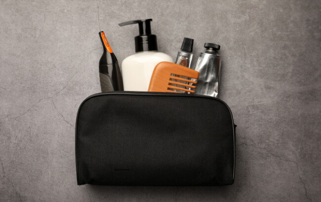 Necessaire com itens de higiene pessoal.