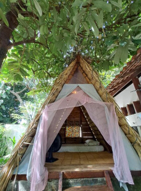 O espaço permite hospedagem em redes e barracas, sendo ideal para viajantes mochileiros ou aventureiros que priorizam a conexão com a natureza.