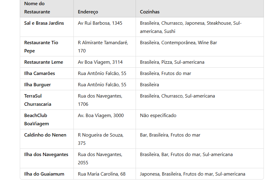 Essa tabela apresenta restaurantes em Boa Viagem baratos com informações sobre localização, especialidades, dá uma olhada: