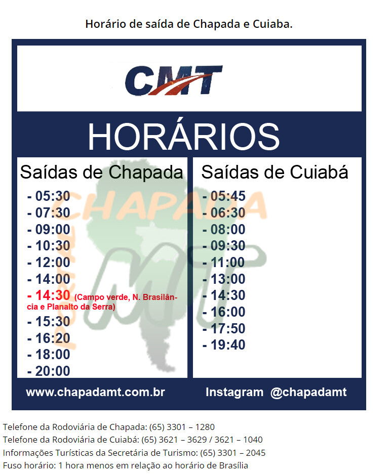 Amiga, eu já fui de busão pra Chapada dos Guimarães pela Rodoviária Chico Moreira. Peguei o ônibus da CMT, e foi super tranquilo! Chega rapidinho e é uma boa opção pra quem não quer ir de carro. Para ajudar vocês eu mandei a tabela de horario que peguei no site.